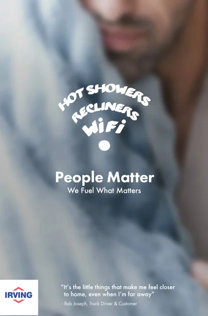 Rebranding for the Canadian-based, Irving, started with a simple concept of showing that the company was equally concerned with the same worries and life experiences that its employees had as well. Through research and interviews with employees, concerns were identified and then represented textually and visually. Each of these initial posters was translated into rollout materials including OOH, editorial, and digital experiences. The digital portion of this project was an interactive 100 foot digital board that allowed employees to experience each others comments and concerns while standing in front of the screen.